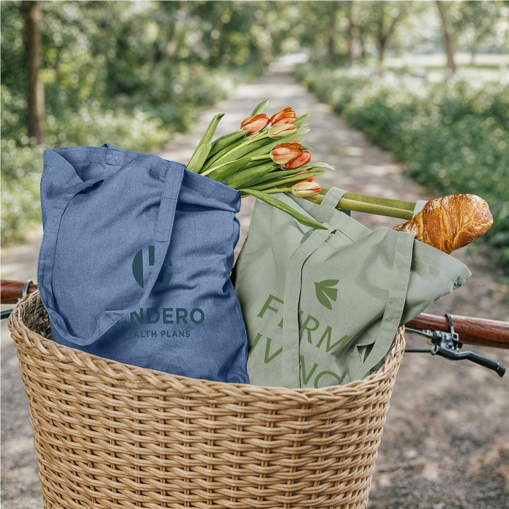 This eco-friendly, reusable tote bag is made from recycled cotton. Promote your brand’s commitment to sustainability with this environmentally conscious purchase.