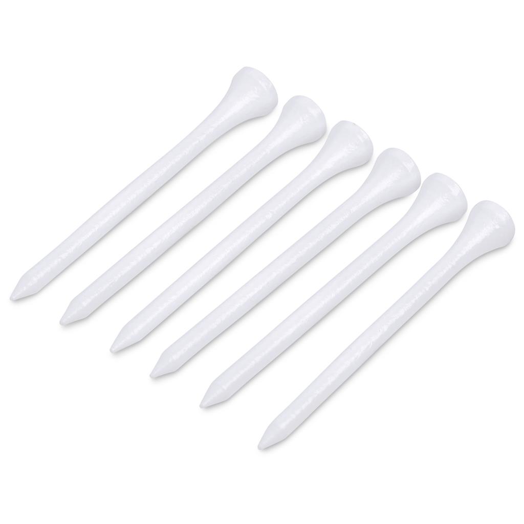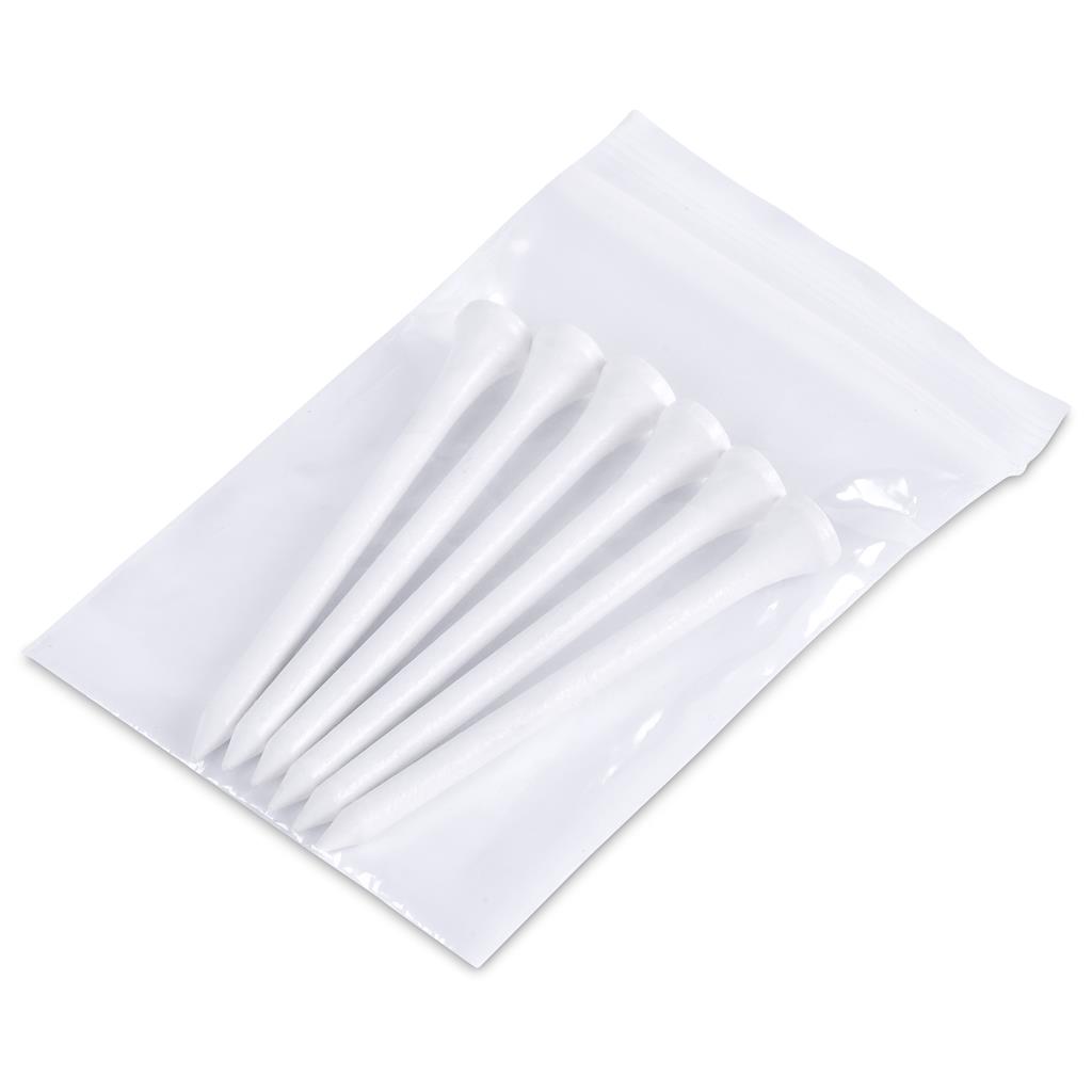 Pack of six 80mm extra-length golf tees neatly packed in a clear, self‑sealing polybag. The resealable packaging allows for easy opening while keeping the tees secure and organised between rounds. Ideal for promotional giveaways and golf days.