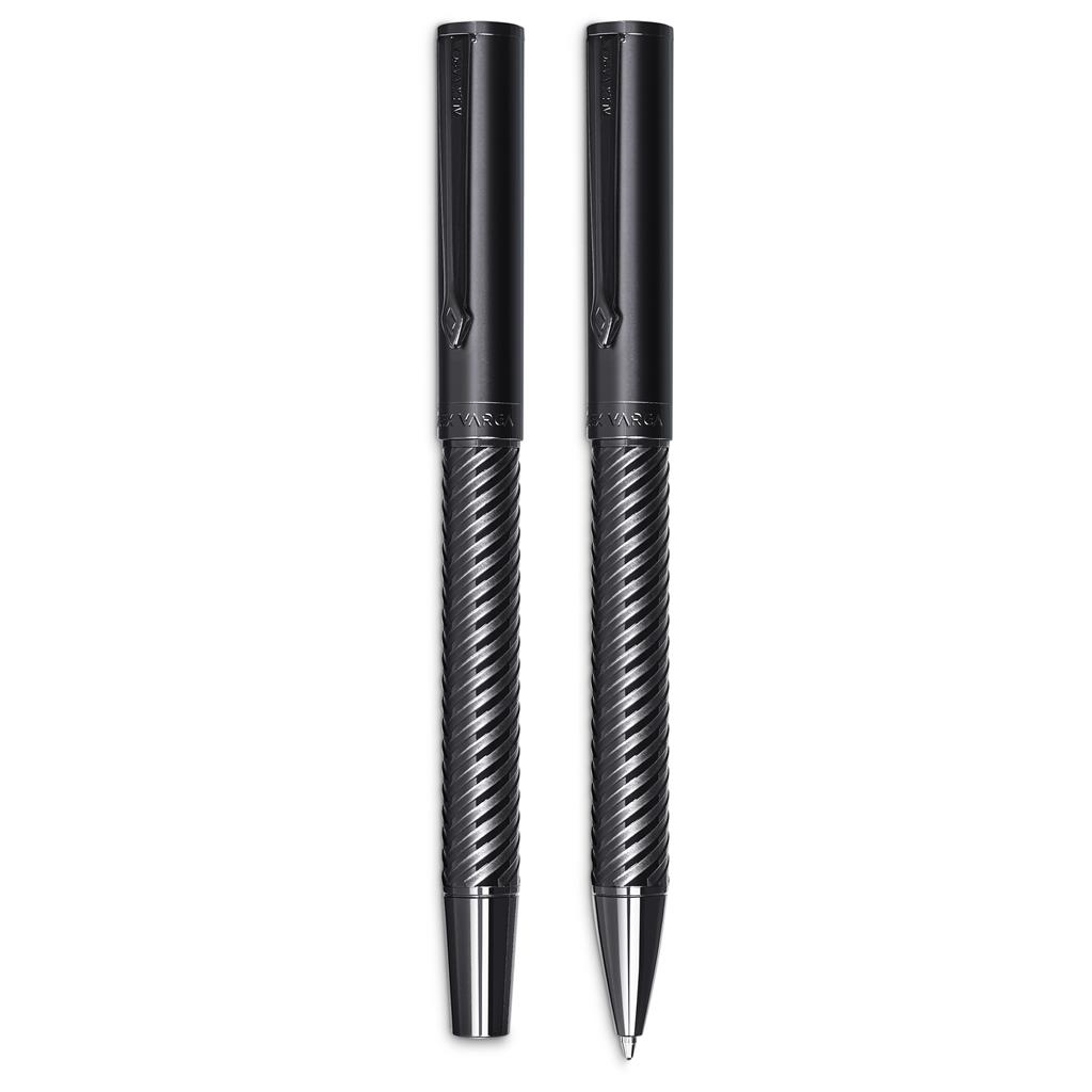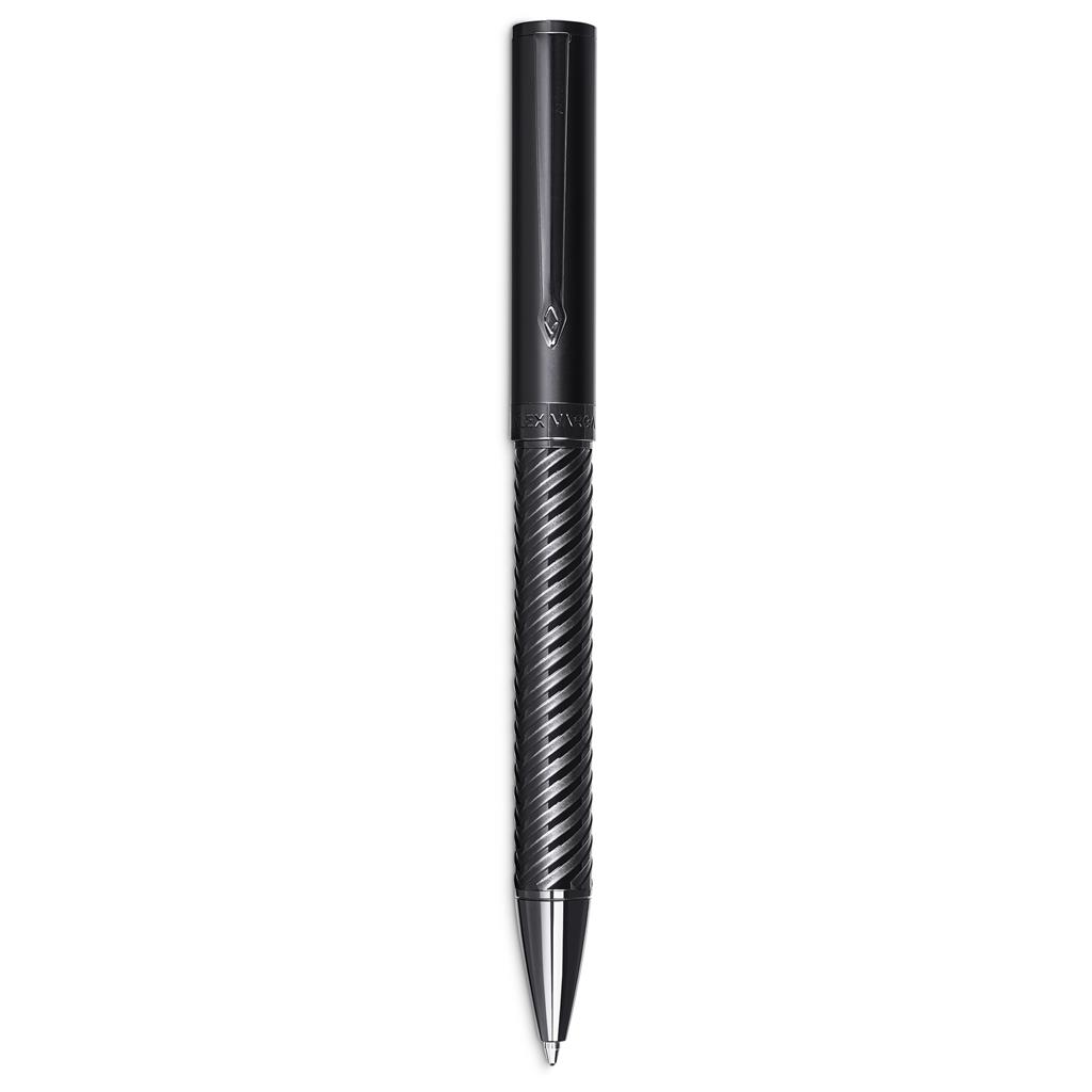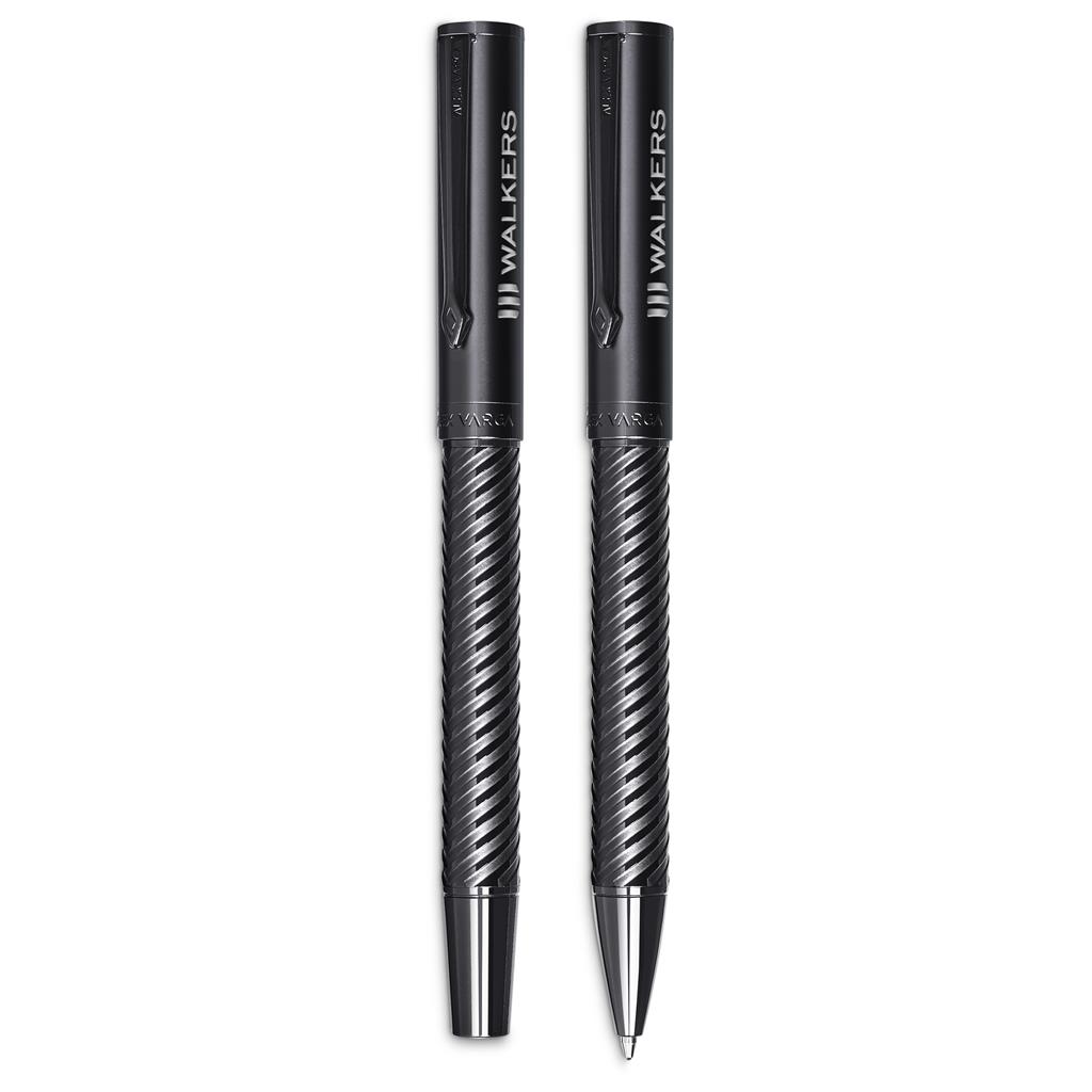 The Alex Varga collection features writing instruments with distinctive yet tasteful designs, and high-quality refills and mechanisms. Each piece or set is presented in elegant packaging, making them gifts which are given with pride and confidence. Both pens in this set combine an embossed patterned lower barrel with a smooth, matte black upper barrel. The ball pen is fitted with a refill which has a minimum writing distance of 3,000 Metres. Replacement refills are available (code AV-19029). View a short clip of the product here