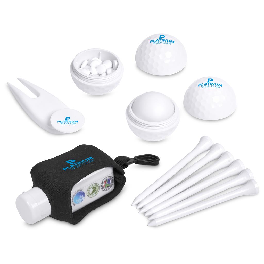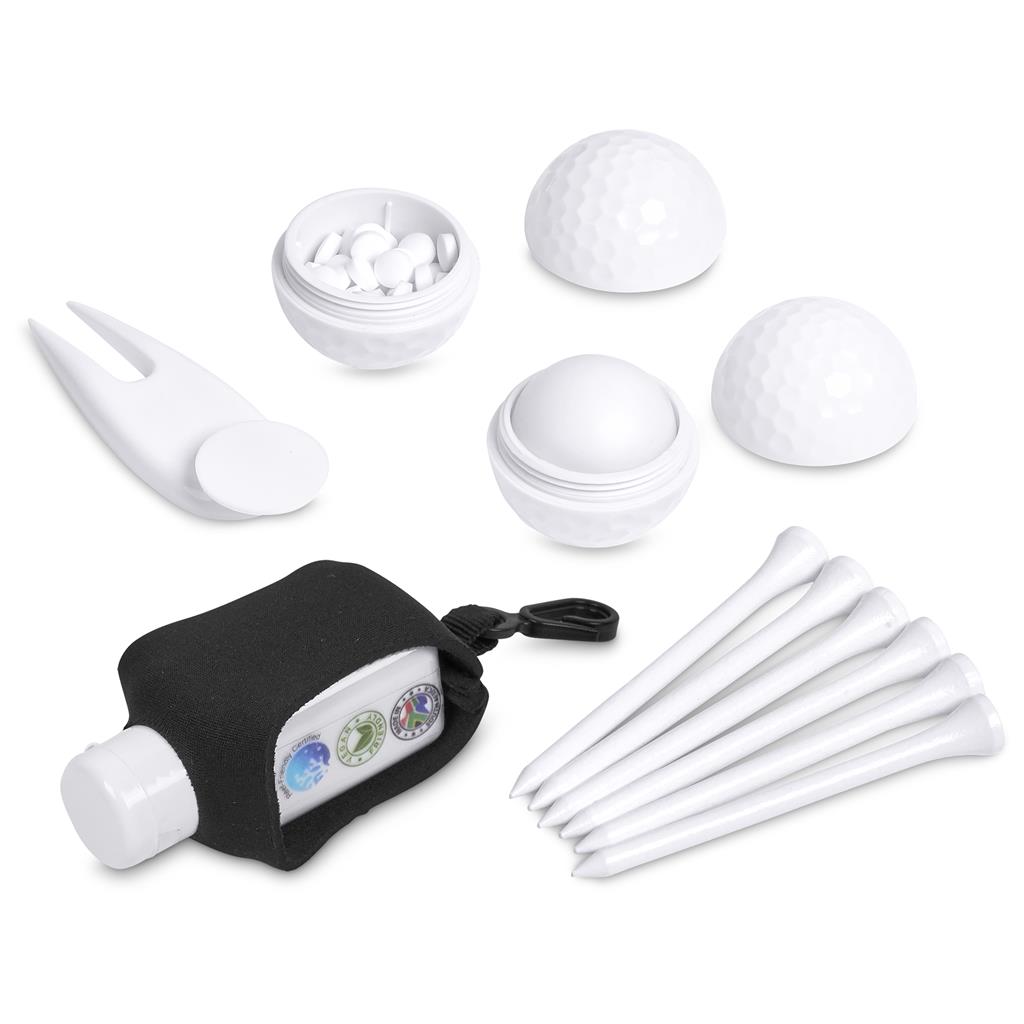 Stay protected and refreshed on the course with this thoughtfully curated golf essential set. It includes SPF 30 sunblock and lip balm for reliable skin and lip protection, complemented by fresh mint candy, six golf tees, divot tool & ball marker, all neatly presented in a zipped pouch for convenient storage and easy access.